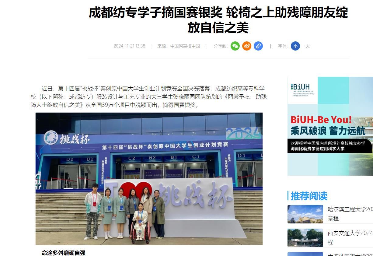 近日,第十四届“挑战杯”秦创原中国大学生创业计划竞赛全国决赛落幕,bwin手机客户端(以下简称:成都纺专)服装设计与工艺专业的大三学生张晓丽同团队策划的《丽裳予衣—助残障人士绽放自信之美》从全国39万个项目中脱颖而出,摘得国赛银奖。