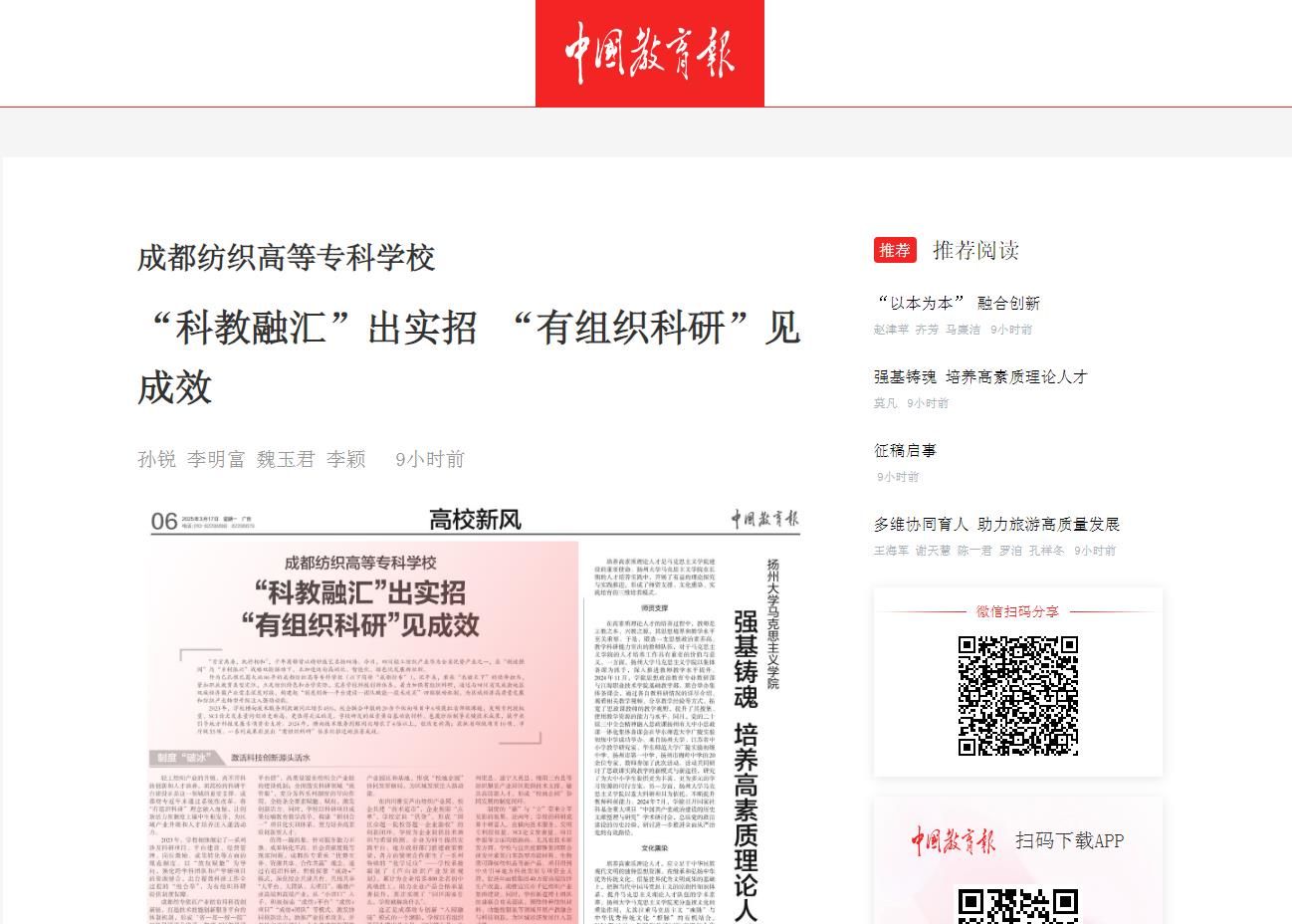 科教兴国是国家重大战略,也是高等职业院校的使命担当;科教融汇则为职教院校的人才培养、科技创新和社会服务指明了前进方向。从千年蜀锦到航天面料,从传统织造到智能制造,成都纺专走出了一条独具特色的有组织科研之路,打通了“科学研究—技术转化—产业服务—人才培养”的链条。“我们既是传统产业的守护者,也要成为新兴产业的开拓者。”成都纺专党委书记任迎伟说。面向未来,学校将持续深化“产学研用”协同,为加快建设纺织强国贡献“成纺智慧”。