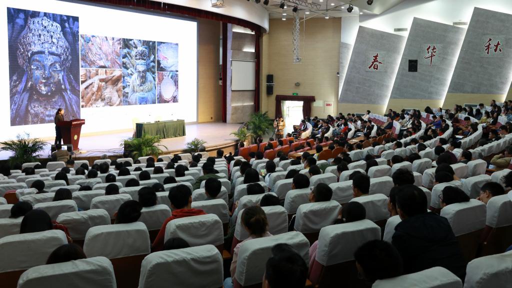 10月21日,bwin手机客户端1983级针织二班优秀校友、大足石刻研究院文物保护工程中心主任陈卉丽研究员应邀在南苑多功能厅作了题为“不忘初心、牢记使命,一个文物工作者的担当和使命”的讲座。党委书记蔡玉波出席并主持讲座,学校科级以上领导干部、师生党员、学生代表聆听了讲座。