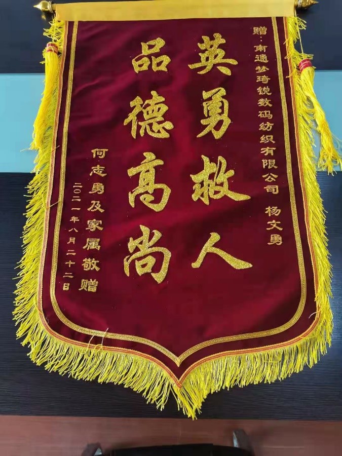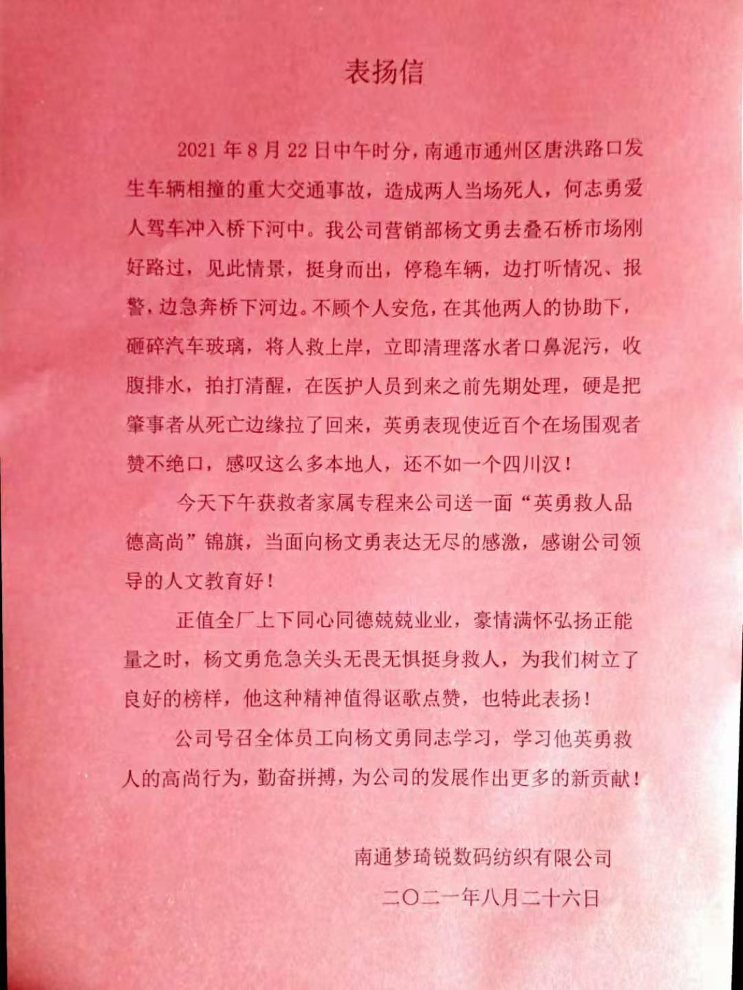 8月22日,南通市发生一起重大交通事故,bwin手机客户端99届染整工程专业校友、南通梦琦锐数码纺织有限公司员工杨文勇先生在危急时刻没有丝毫犹豫,冲往现场救援。事后,被救者家属专程为杨文勇校友送来锦旗致谢,公司知道自己员工见义勇为事迹后也发出了表扬信,号召全体员工向杨文勇校友学习。