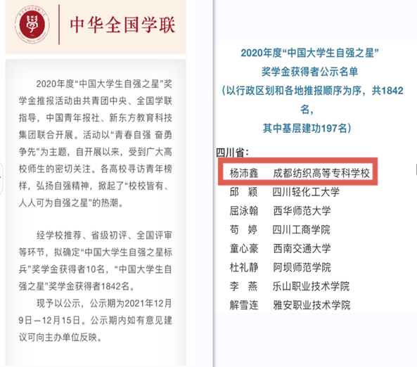 12月15日,2020年度“中国大学生自强之星”奖学金获得者名单公示结束,结果揭晓,bwin手机客户端智能建造与环境工程学院2019级学生杨沛鑫荣获2020年度“中国大学生自强之星”奖学金。