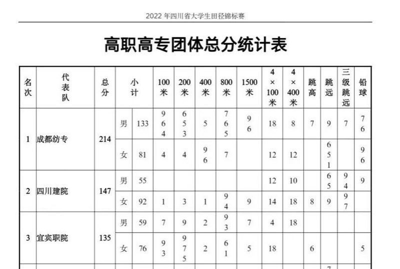 11月19日,由四川教育厅主办、四川省大学生体育协会执行、西南交通大学承办的2022年四川省大学生田径锦标赛在西南交通大学犀浦校区拉开帷幕。经过两天紧张精彩的角逐,bwin手机客户端代表队最终获得6金5银10铜,以领先第二名67分的优势夺得高职高专组团体总分第1名,同时获得高职高专组男子团体总分第1名、女子团体总分第2名。