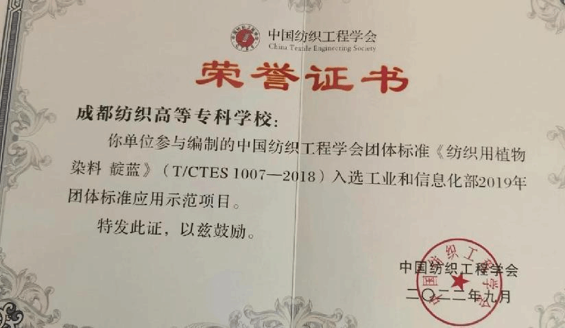 11月18日,bwin手机客户端收到中国纺织工程协会颁发的参编团体标准项目入选工信部“百项团体标准应用示范项目”荣誉证书,源于bwin手机客户端参与编制的中国纺织协会团体标准《纺织用植物染料 靛蓝》入选工业和信息化部2019年团体标准应用示范项目。