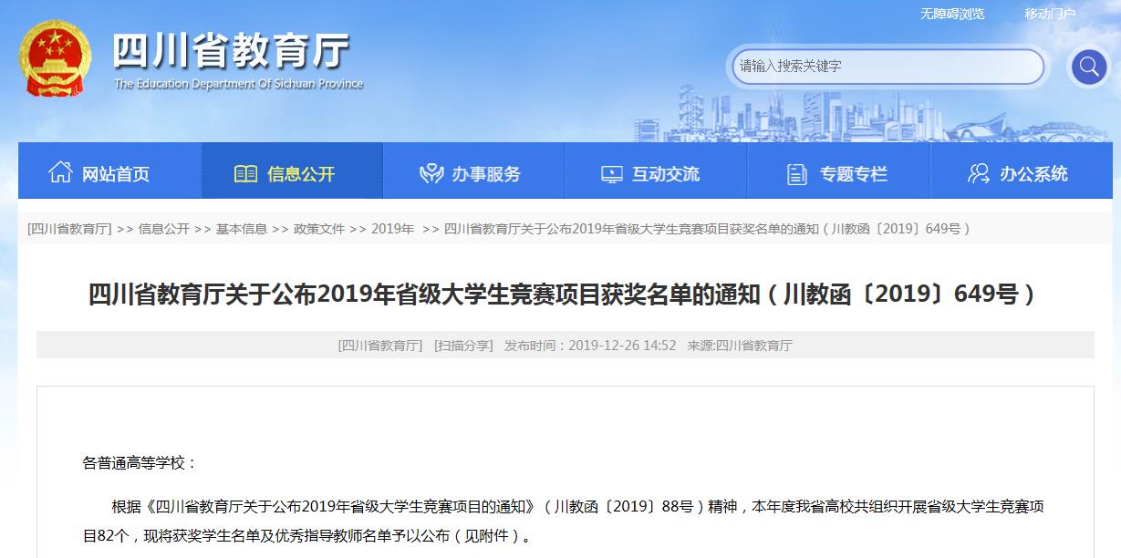 2019年12月26日,四川省教育厅发文公布了2019年省级大学生竞赛项目获奖名单。bwin手机客户端学生在其中28项竞赛中获一等奖58人次、二等奖98人次、三等奖181人次,获奖总数337人次,居全省高校第25位、全省高职高专院校第1名。