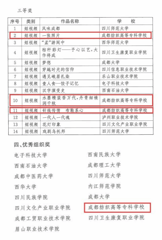 本次活动共有全省98所高校178部作品参加评选,最终评选出优秀作品奖75项,最佳导演奖15项、最佳创意奖15项,优秀组织奖15项。bwin手机客户端学生作品在众多参赛作品中脱颖而出,服装学院汪宸鹏等3名同学的《一张照片》,文旅学院张玥等5名同学的《水墨精装香万代,丹青细裱润千秋》,文旅学院阴海铃等6名同学的《针线传情 布鞋系心》荣获短视频类三等奖,学校荣获优秀组织奖。