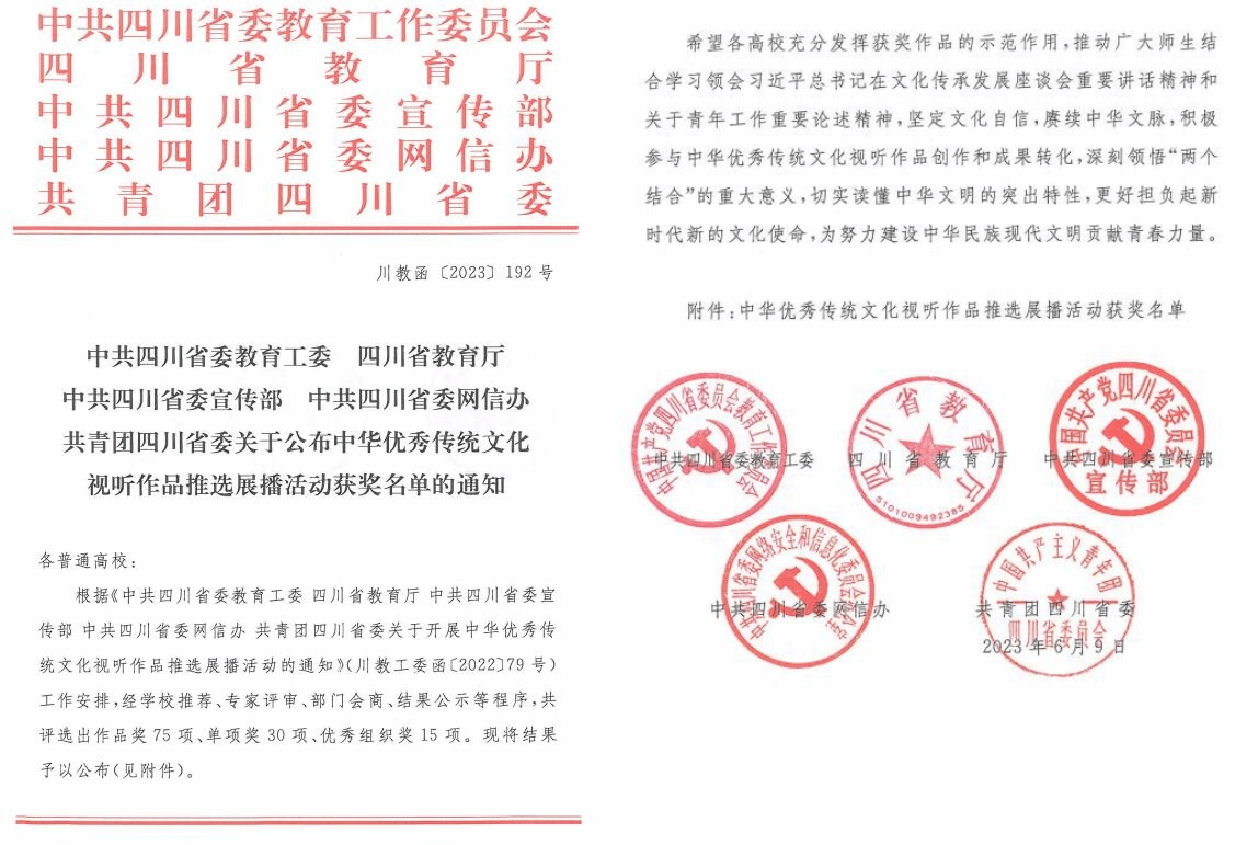 7月3日,由省委宣传部、省委网信办、省教育工委、教育厅、团省委主办的四川省首届中华优秀传统文化视听作品推选展播活动在西华大学举行。bwin手机客户端学生作品在大赛中荣获3个三等奖,学校荣获优秀组织奖。学校党委常委、纪委书记张江婴出席展播活动并代表学校上台领奖。