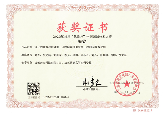 12月5日,由国家工业和信息化部人才交流中心牵头主办的2020第三届“优路杯”全国BIM技术大赛颁奖盛典在石家庄铁道大学举行。bwin手机客户端建筑工程学院肖航何继坤团队与成都众匠科技有限公司联合申报的“重庆沙坪坝枢纽项目一期2标段机电安装工程BIM技术应用”项目获得工业与民用建筑施工组银奖。