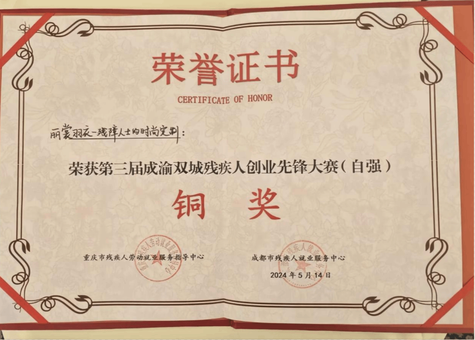5月13日至15日,“先锋引领·创就梦想”第三届成渝双城残疾人创业先锋大赛路演评选暨表彰仪式在重庆举行。经过激烈角逐,bwin手机客户端服装学院创新创业项目“丽赏羽衣---残障人士的时尚定制”摘得第三届成渝双城残疾人创业先锋大赛“自强类”铜奖。