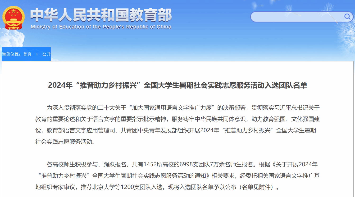 据悉,全国共有1452所高校的6998支团队、7万余名师生报名参加2024年“推普助力乡村振兴”全国大学生暑期社会实践志愿服务活动。经过遴选与专家审议,最终有1200支团队入选。其中,195所高职院校入选,四川省共8所。