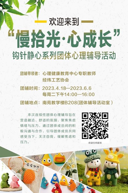 现心理中心面向全校学生招募“慢拾光,心成长”钩针静心系列团体心理辅导活动,欢迎各位同学踊跃报名!