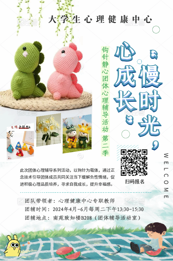 现学校心理健康中心面向全校学生招募“慢拾光,心成长”钩针静心系列团体心理辅导活动成员,欢迎各位同学踊跃报名!