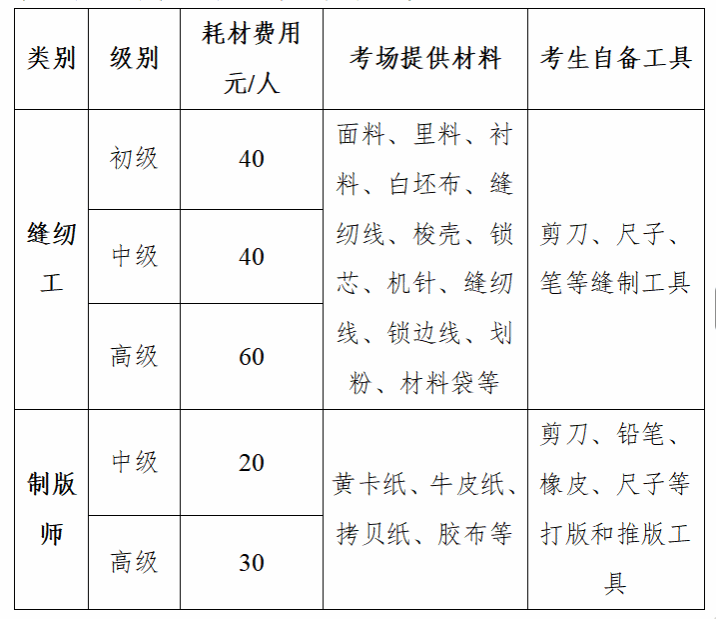另根据《四川省发展和改革委员会四川省财政厅关于重新公布全省人力资源社会保障部门行政事业性收费的通知》(川发改价格〔2017〕472号)、《四川省发展和改革委员会四川省财政厅关于全省人力资源社会保障部门行政事业性收费的通知》(川发改价格规〔2023〕473号)文件:裁剪缝纫等操作技能考试所需的原材料、主料可由认定机构代办并按实际成本收费或由考生自备。
