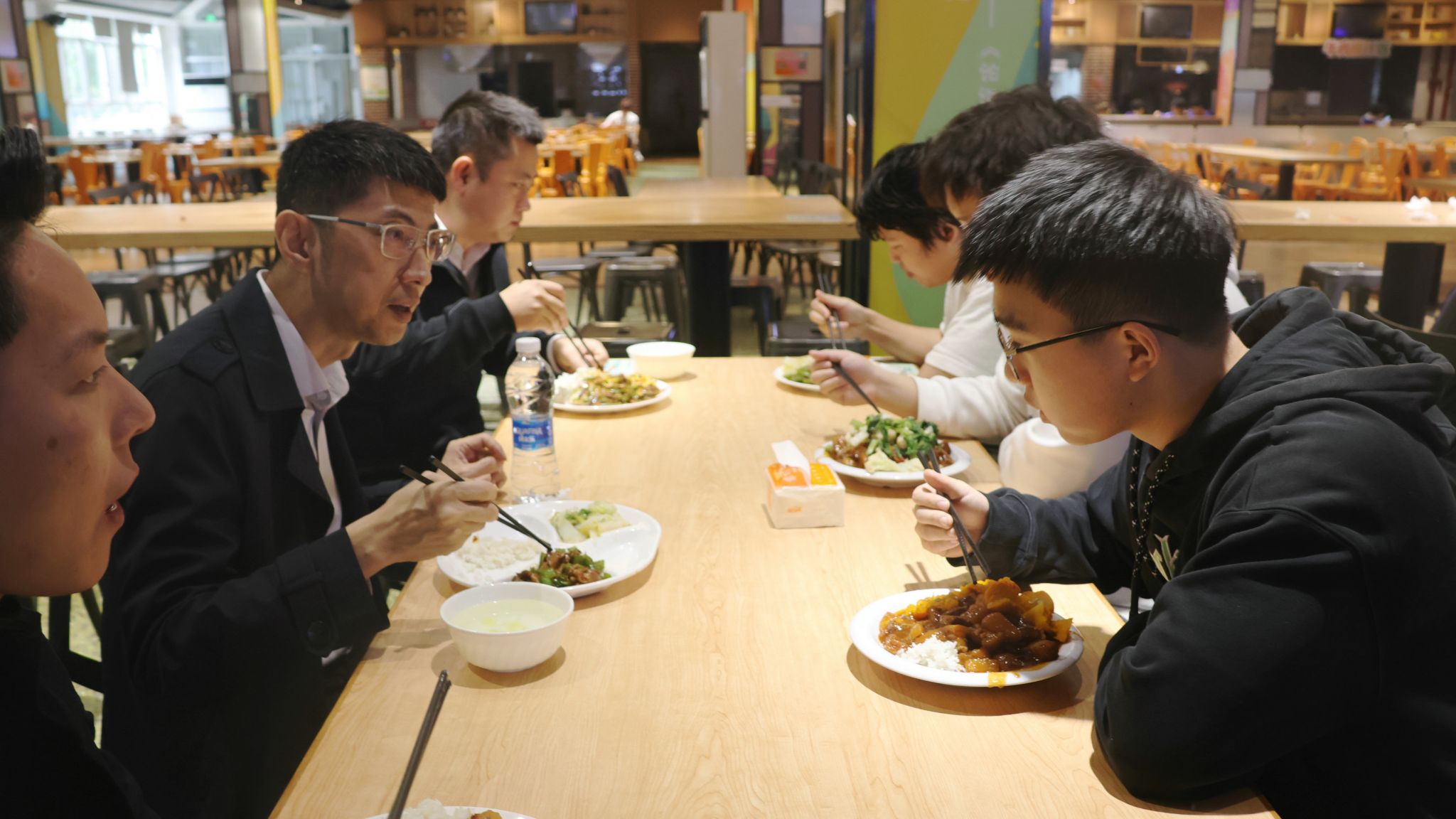 随后,宋超来到保障餐窗口买好饭,随机选择学生一同就餐、聊天。他仔细询问同学们的专业情况,了解同学们对学校、专业和老师的看法,鼓励他们积极参与校企合作项目、科研与竞赛项目,利用学校和企业提供的良好条件,加速成长,为实现良好就业和升学深造打好基础。